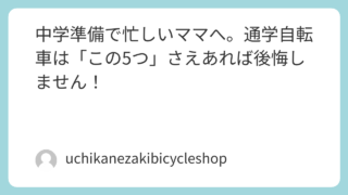 通学車について買ったあとが大事。修理編 「いってらっしゃい」のあと、お子様の自転車は大丈夫?制服やカバン、準備も大変ですが、やっぱり一番心配なのは毎日の自転車通学ですよね。「ブレーキ、ちゃんと効いてるかな?」 「タイヤの空気、減ってないかな?」忙しいお母さんに代わって、私が毎日プ... 2024.02.03通学車について